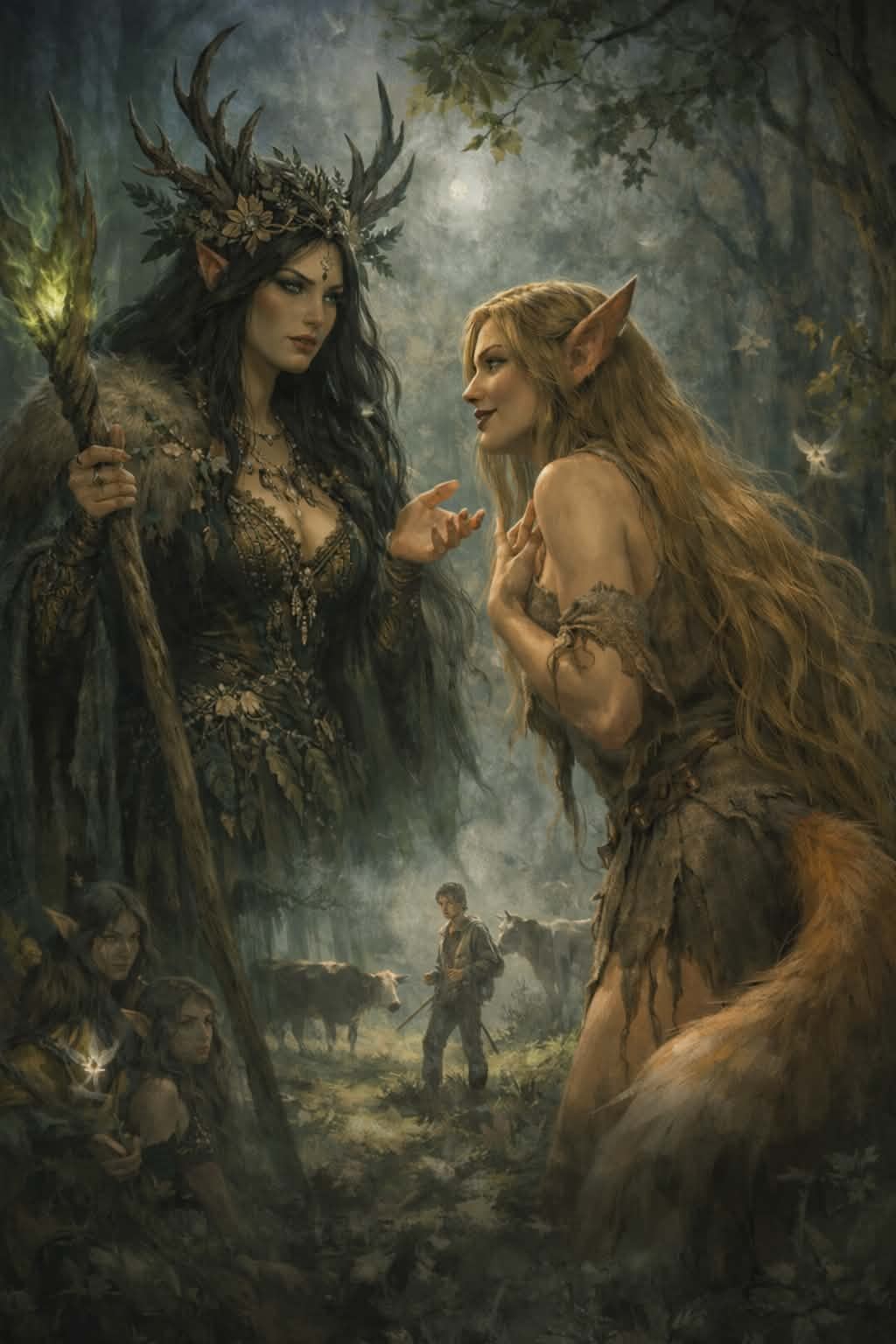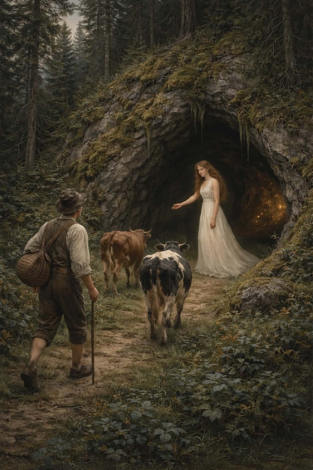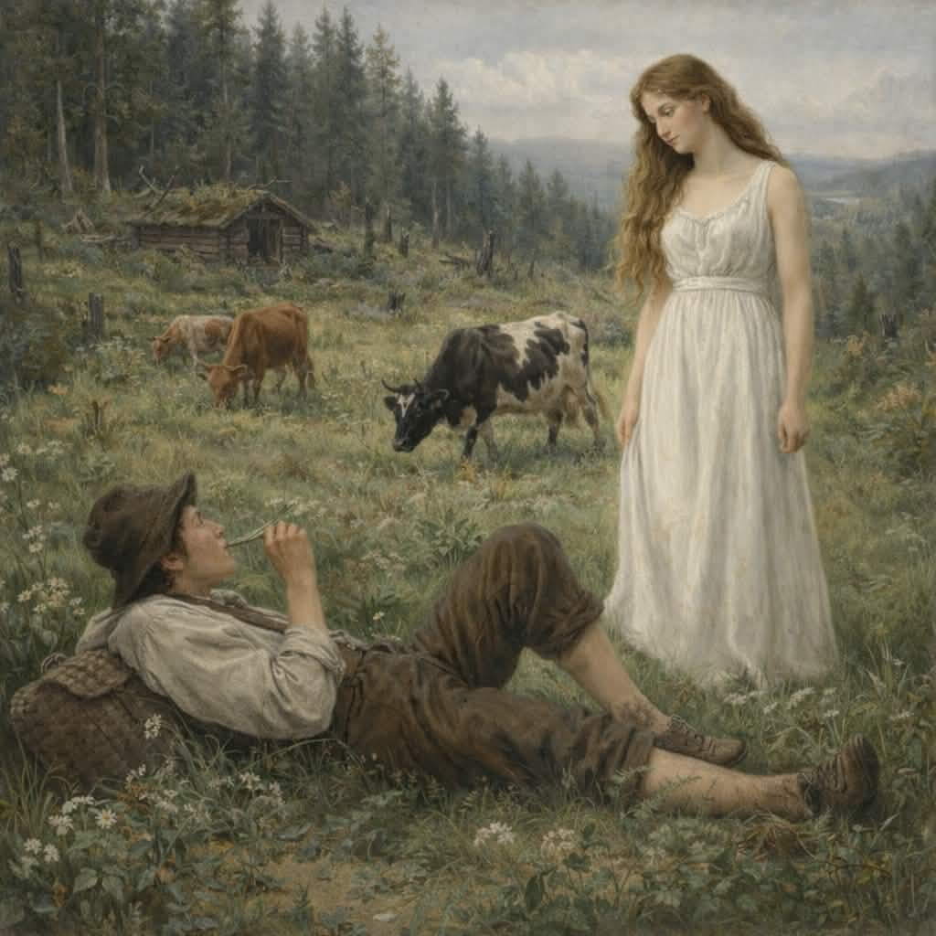 En ung kvinne kom gående ned fra skogen, lys i huden, mørk i øynene – så vakker at selv fuglene sluttet å synge. Hun lo dempet og sa hun ville hjelpe ham med å samle buskapet før sola gikk ned. Lars nikket, blendet og uforsiktig, lite visste han om at hun var sendebudet til Mielikki, skogens herkserinne og vokteren av det forbudte området.