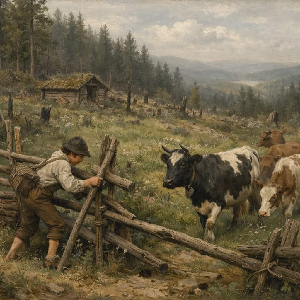 Men Lars, han ville vise seg. En klar sommerdag drev han sine tretten kuer opp mot Høgsjøberget, rett gjennom den gamle skigarden og inn på den frodigste enga i hele dalen – midt i det forbudte. Han la seg til å hvile og hørte kubjellene klinge mykt i sola. Alt var stille, helt stille.